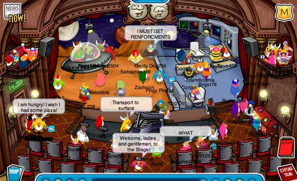 If you haven’t already seen it, you should definitely check out the new stage! We hope Club Penguin is always a place to express your creativity and I’m sure The Stage is going to make that even better. Some fun things to do are to use the script and put on a costume to put on a play, or just hang out and watch a great show. If you’re into music and have an instrument, the black area in front of the stage is for you to use. It’s called “the pit” in stage language.