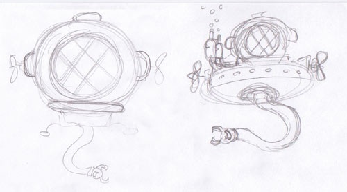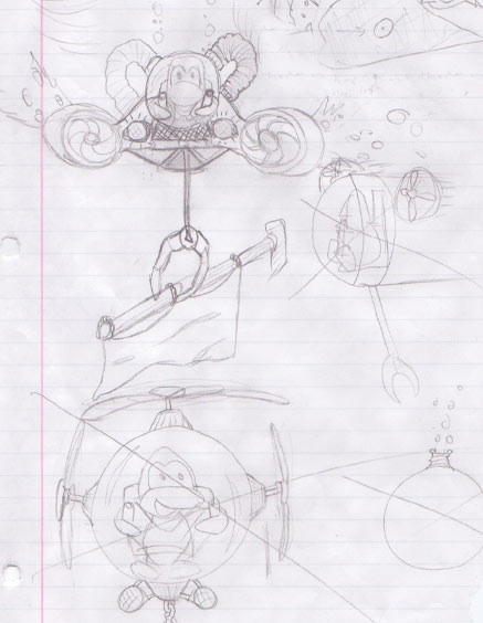 This is the first game we’ve ever done where penguins can actually go underwater (unless you count crashing in Hydro-Hopper, Jet Pack Adventure or Catchin’ Waves). To let the penguins go underwater, we had to design a submarine! Here are some of the first sketches for the sub: