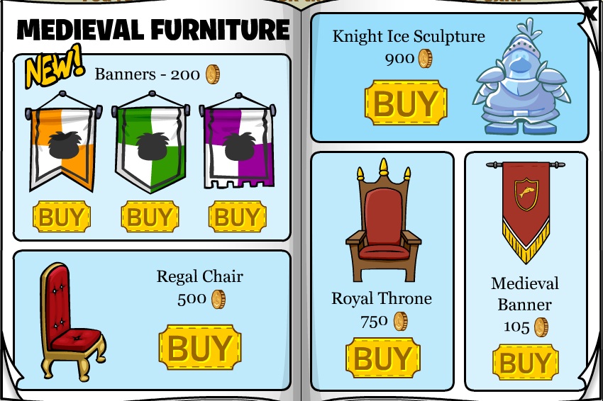 The medieval party is still going strong and I hope you’re all having tons of fun! Its not over yet–there’s more to come later this week! On Friday the Medieval Igloo Decorating contest starts so be sure to save your coins! You’re going to need them to decorate your igloo when the new furniture catalog comes out on Friday! It is going to be stacked with medieval items!! So make sure you wait until Friday to start decorating. I grabbed a few screen shots of some of the items to inspire some creative decorating ideas!!Check it out!