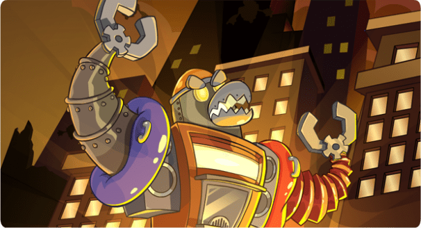 The original Ultimate Protobot 10K was created by the Test Bots. He was made from various parts and items from around Club Penguin, including speakers, Aqua Grabber Claws, the Ticket Booth, and a Mine Cart. He has been destroyed and rebuilt several times.