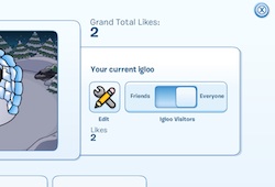 You can see how many “Likes” your igloo design has by opening your igloo editor. You can see how many penguins like each igloo, and view your total number of “Likes”.