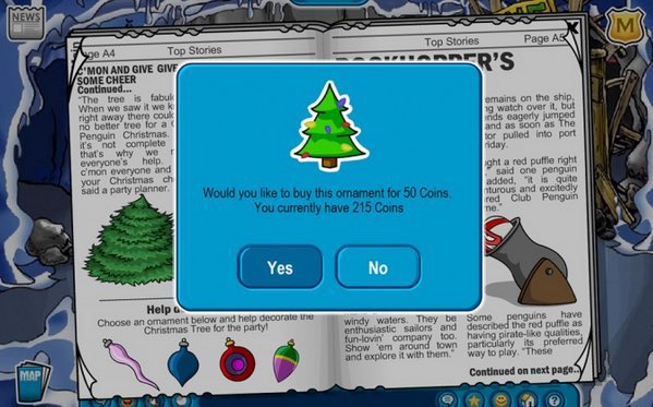 - How to Obtain: Penguins had to decorate the Christmas Tree on page A4 in Issue #61 of The Penguin Times, then could purchase the Pin for 50 coins