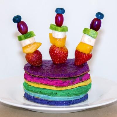 - Stack cooked pancakes in rainbow order and insert 6 fruit skewers into the pancakes creating a rainbow shape.